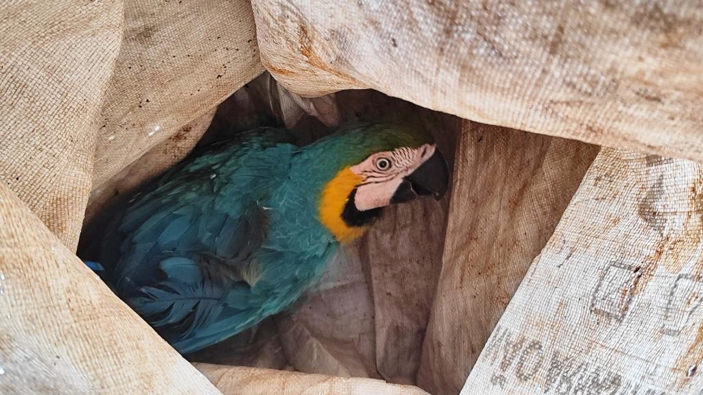 O Corpo de Bombeiros Militar de Mato Grosso (CBMMT) resgatou três filhotes de gatos e uma arara-canindé que estavam em locais de risco no município